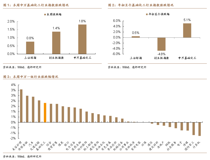 本周基础化工板块表现好于大盘。根据Wind,本周(5/9-5/16)上证综指涨跌幅为+0.8%,创业板指数涨跌幅为+1.4%;申万基础化工行业指数涨跌幅为+1.8%,在全部31个行业板块中位列第5位,跑赢上证综指1.1个百分点,跑赢创业板指数0.4个百分点。年初至今,上证综指涨跌幅为+0.5%,创业板指数涨跌幅为-4.8%;申万基础化工行业指数涨跌幅为+5.1%,跑赢上证综指4.7个百分点,跑赢创业板指数9.9个百分点。
