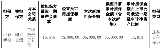 PT Changsu Industrial Indonesia(中文名称:印尼长塑实业有限公司,以下简称“印尼长塑”)为公司全资三级子公司,公司间接持有其100%的股权。近日,印尼长塑与中国进出口银行厦门分行签订《借款合同》,公司为上述事项提供担保,具体情况如下表: