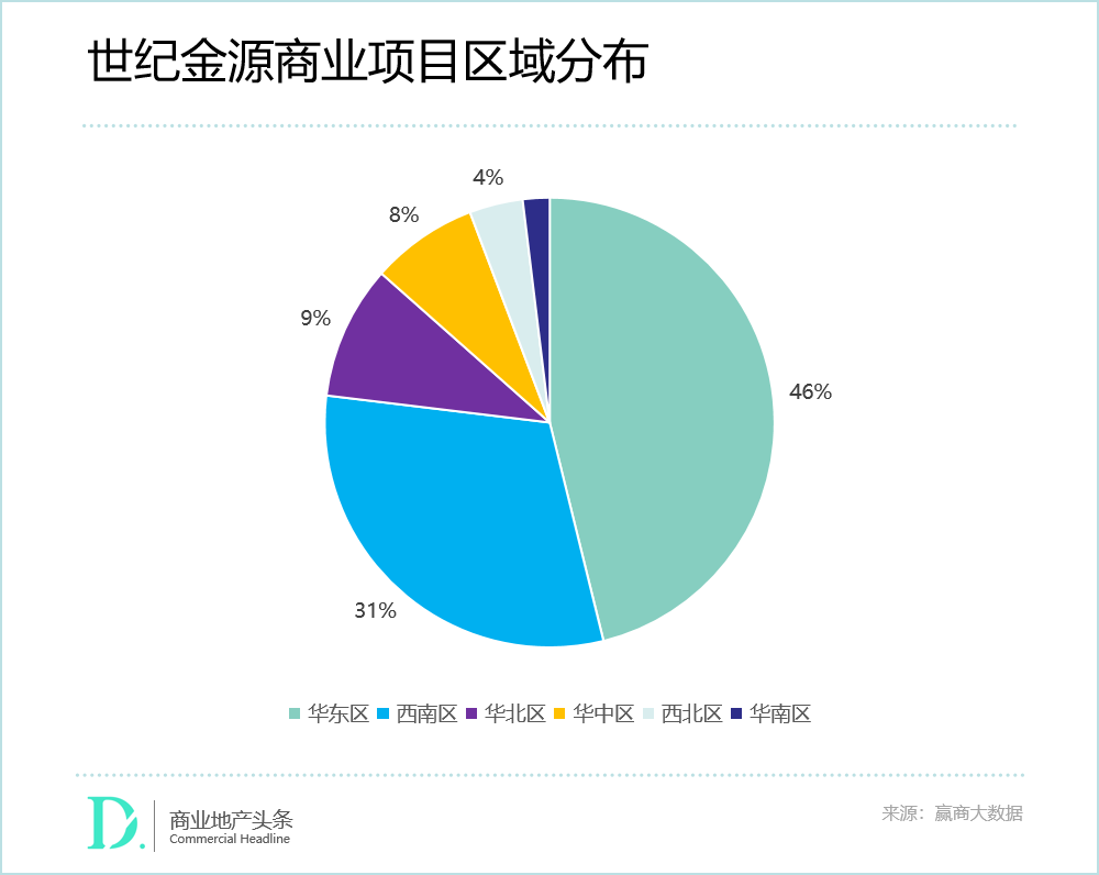 据赢商大数据统计,按区域划分,世纪金源商管已开业项目中有46%位于华东区,31%位于西南区,华南区项目最少。