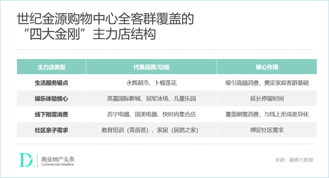 据赢商研究中心分析,以上8个“世纪金源购物中心”的业态组合,形成了全客层覆盖的“四大金刚”主力店结构。其中,有3个引入居然之家,7个引入永辉超市,5个引入苏宁易购,集团旗下的一站式儿童主题MALL童兜天地、教培品牌青苗荟和英嘉国际影城,家具卖场、大型超市、亲子设施和电影院是世纪金源购物中心的标配。