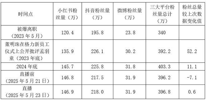 且不说参加节目以"董明珠接班人"的身份走入公众视野,怀揣约340万粉丝量离开格力,在离职后的7个多月中,因多次与格力相关的热议事件,孟羽童又在小红书、抖音、微博三大核心平台上涨粉超50万。