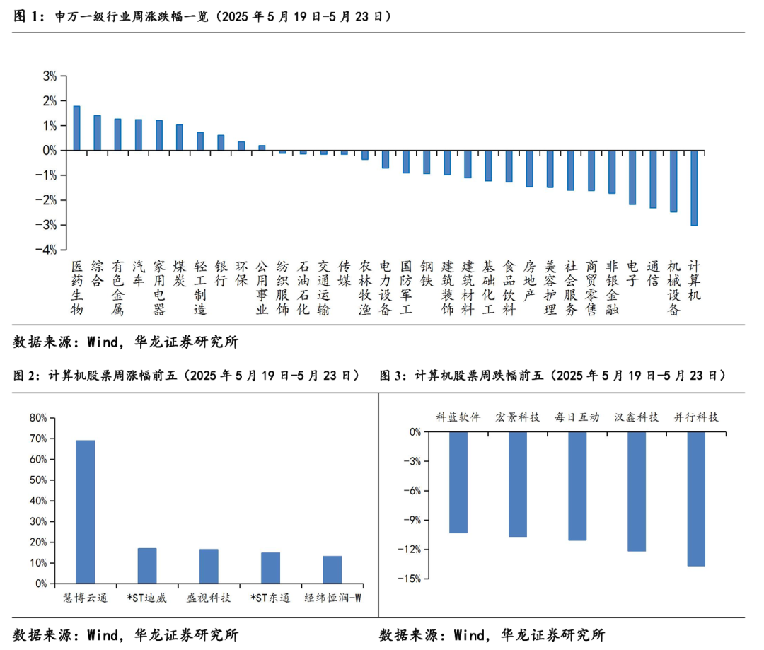 2025年5月19日-5月23日,申万计算机指数下跌3.02%。板块个股涨幅前五名分别为慧博云通(301316.SZ)、*ST迪威(300167.SZ)、盛视科技(002990.SZ)、*ST东通(300379.SZ)、经纬恒润-W(688326.SH)。
