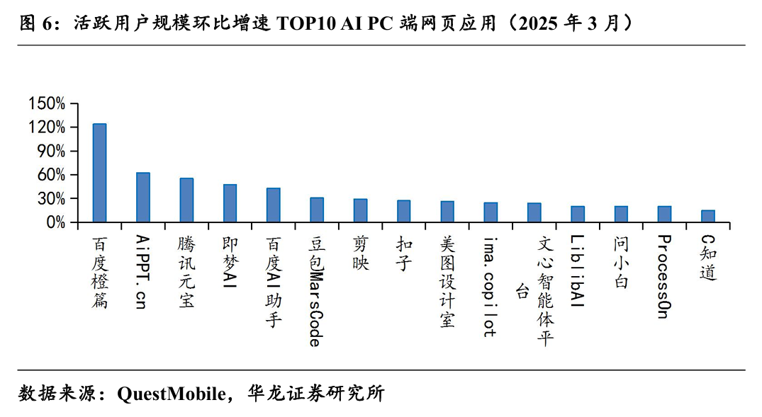 我们认为,美图与阿里合作开发数据驱动的电商生图/视频工具,印证了生成式AI向垂直领域渗透的趋势。根据QuestMobile数据,2025年3月,国内活跃用户规模环比增速前15的PC端AI应用中,美图设计室位列第九,活跃用户规模环比增长26.2%。当前,具备行业Know-how的AI应用公司投资价值正在凸显。同时,大模型、AI应用带来的训练和推理算力需求使得中小厂商与云服务厂商的合作更为紧密,垂类AI应用公司与平台型巨头的资源置换将成为主流。