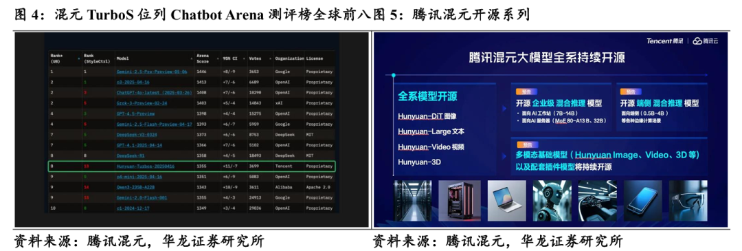 (1)加速模型创新:腾讯于年初推出的快思考模型混元Turbo S在全球权威排行中位列全球前8,国内仅次于DeepSeek。多模态模型方面,视觉深度推理模型——混元T1-Vision目前已经上线元宝。端到端语音通话模型——混元Voice也即将上线腾讯元宝。同时,多模态模型能力将会集成在腾讯云上。另外,腾讯将进一步推动混元模型开源,推进多尺寸、多场景的模型开源计划,降低企业应用门槛。
