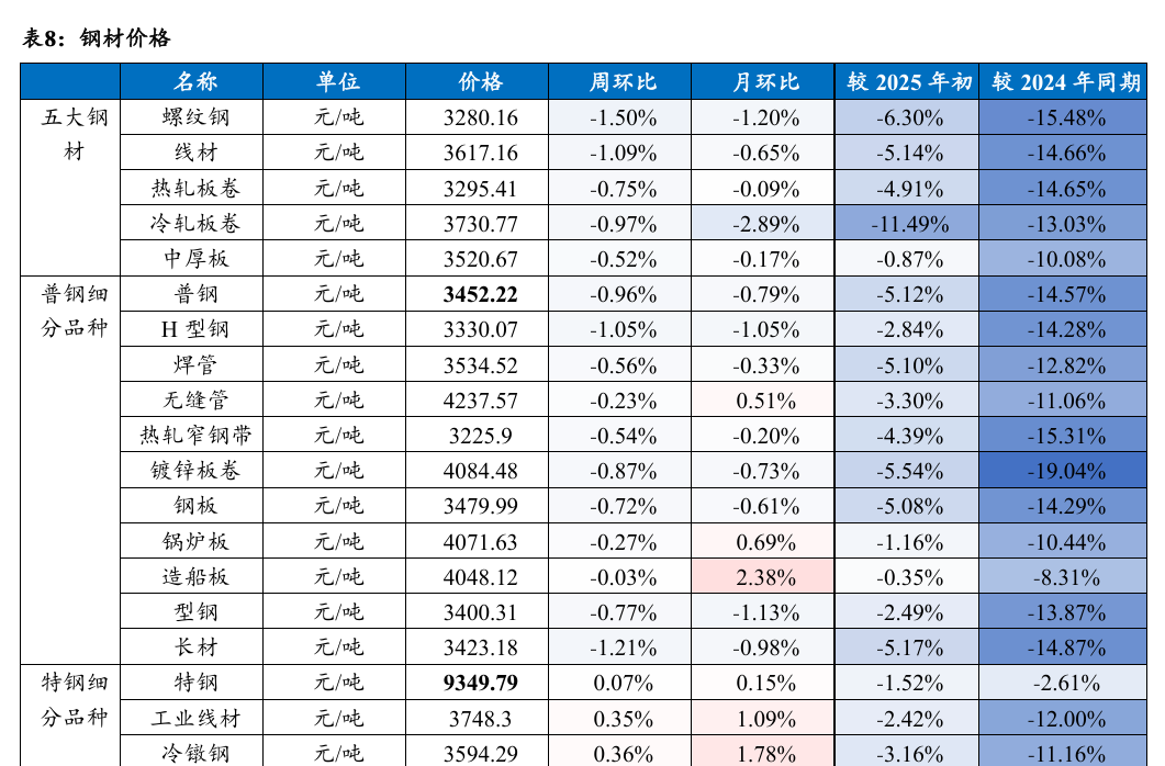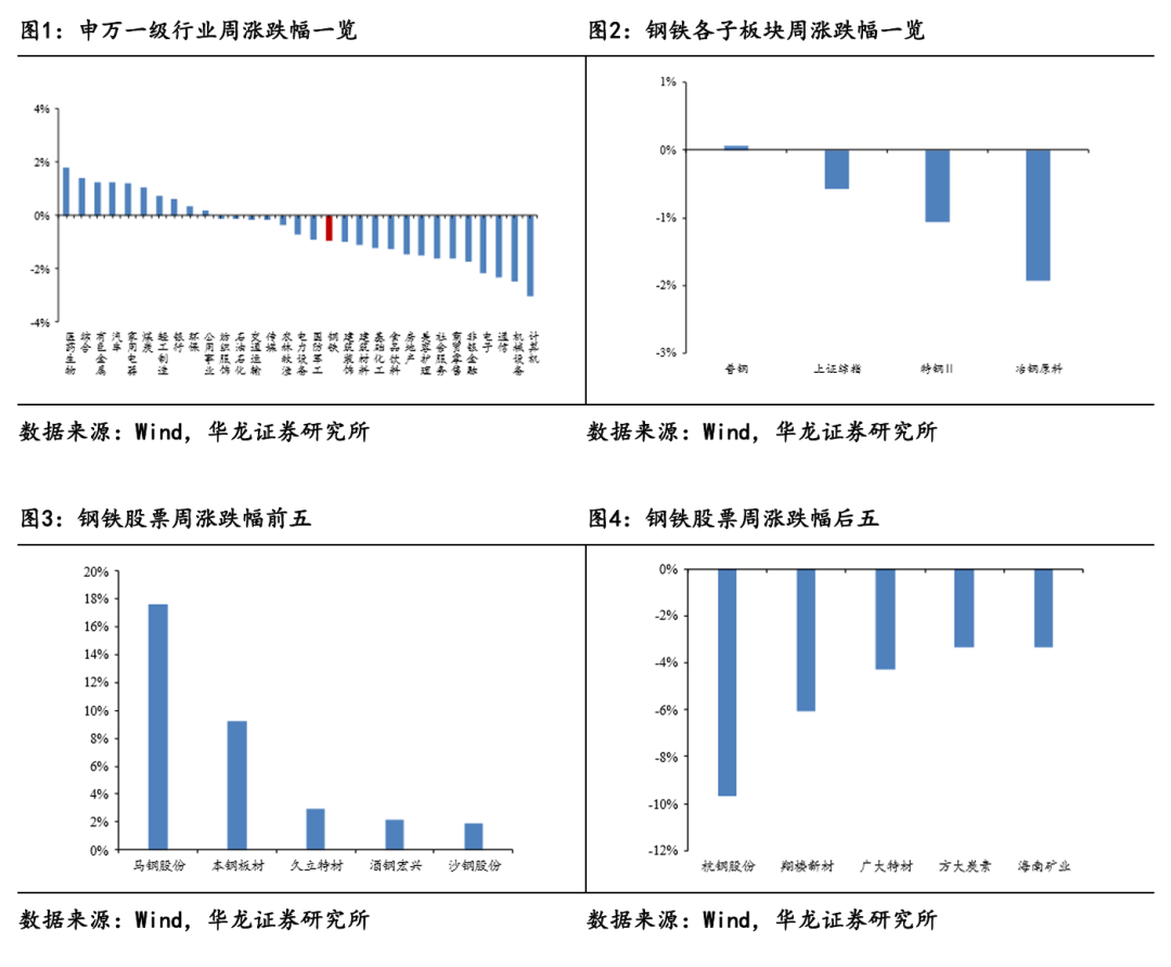 在重点覆盖公司中,个股涨跌幅前五的公司为马钢股份(17.63%)、本钢板材(9.23%)、久立特材(2.92%)、酒钢宏兴(2.16%)、沙钢股份(1.88%);个股涨跌幅后五的公司为杭钢股份(-9.70%)、翔楼新材(-6.09%)、广大特材(-4.27%)、方大炭素(-3.35%)、海南矿业(-3.35%)。