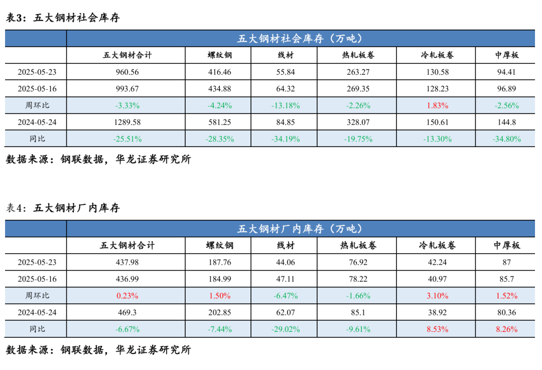 截至2025年5月23日,五大钢材合计社会库存960.56万吨,周环比下降3.33%,同比下降25.51%;五大钢材合计厂内库存437.98万吨,周环比上升0.23%,同比下降6.67%。
