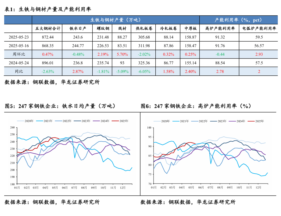 截至2025年5月23日,五大钢材合计产量872.44万吨,周环比上升0.47%,同比下降2.63%;247家钢铁企业铁水日均产量243.6万吨,周环比下降0.48%,同比上升2.87%;247家钢铁企业高炉产能利用率91.32%,周环比下降0.44 pct,同比上升2.78 pct;87家独立电弧炉钢厂产能利用率59.5%,周环比上升2.93 pct,同比上升2.00 pct。钢厂盈利率59.74%,周环比增加0.43pct,同比增加7.79pct。
