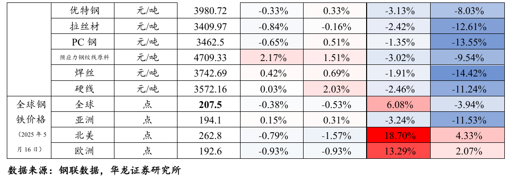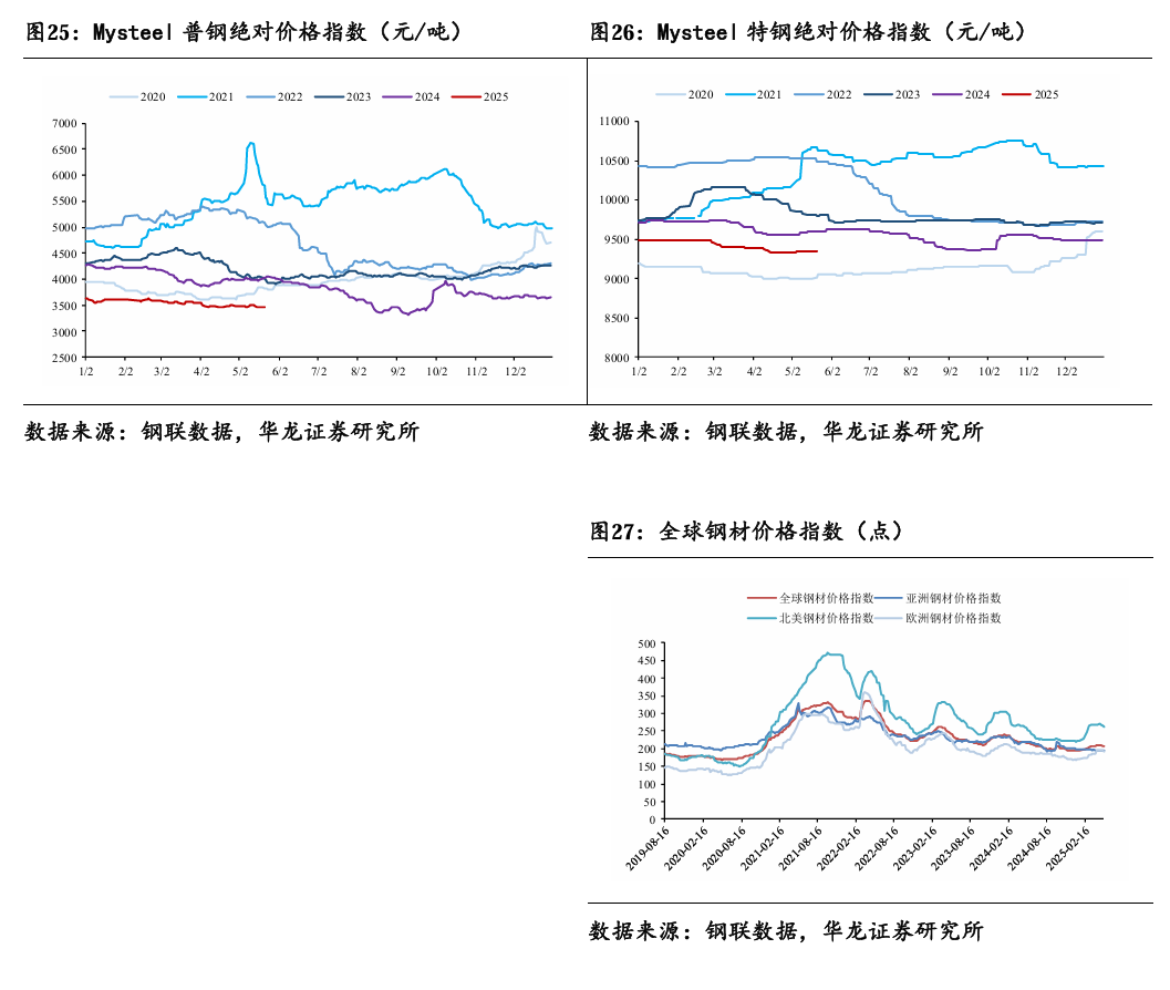 价格端:截至2025年5月23日,Mysteel普钢绝对价格指数3452.22元/吨,周环比-0.96%,月环比-0.79%,同比-14.57%;Mysteel特钢绝对价格指数9349.79元/吨,周环比+0.07%,月环比+0.15%,同比-2.61%;2025年5月16日,全球钢材价格指数207.5点,周环比-0.38%,月环比-0.53%,同比-3.94%。随着淡季开启,需求温和下降,原料端支撑减弱,预计短期钢材价格偏弱震荡运行。