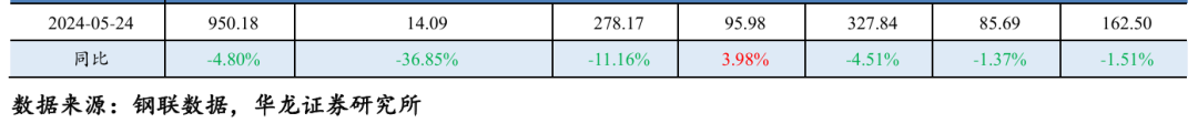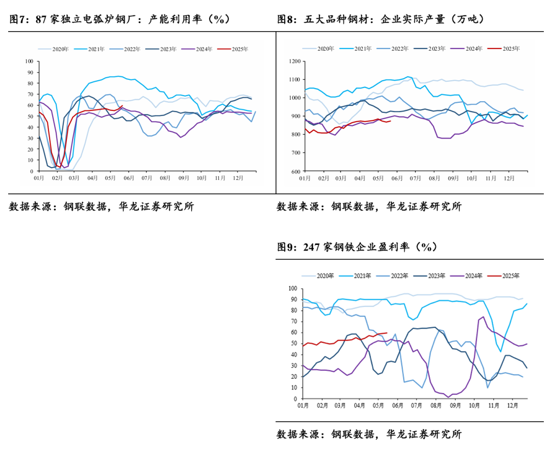 供给端:截至2025年5月23日,五大钢材合计产量872.44万吨,周环比上升0.47%,同比下降2.63%;247家钢铁企业铁水日均产量243.6万吨,周环比下降0.48%,同比上升2.87%;247家钢铁企业高炉产能利用率91.32%,周环比下降0.44 pct,同比上升2.78 pct;87家独立电弧炉钢厂产能利用率59.5%,周环比上升2.93 pct,同比上升2.00 pct。钢厂盈利率59.74%,周环比增加0.43pct,同比增加7.79pct。本周五大钢材中除热轧卷板外,其他钢材供给周环比小幅增加,进入季节性淡季,钢厂开始提前安排检修,抑制高炉铁水产量,铁水日产周环比小幅下降,盈利水平小幅上升。