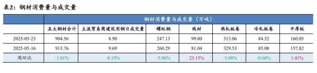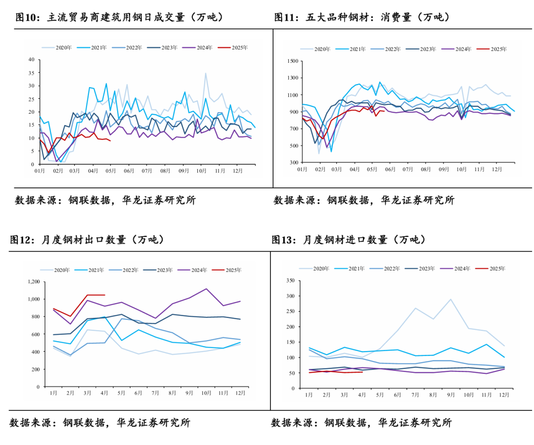需求端:截至2025年5月23日,五大钢材合计消费量904.56万吨,周环比下降1.01%,同比下降4.80%;主流贸易商建筑用钢日成交量8.90万吨,周环比下降8.19%,同比下降36.85%;截至2025年4月,钢材单月出口数量合计1046.24万吨,月环比上升0.06%,同比上升13.42%,月度累计出口数量合计3789.09万吨,月环比上升38.14%,同比上升8.19%。本周五大钢材中除线材及中厚板外,消费量均周环比下降,5月下旬南方降水增加,需求淡季,建筑钢材市场预计需求放缓。
