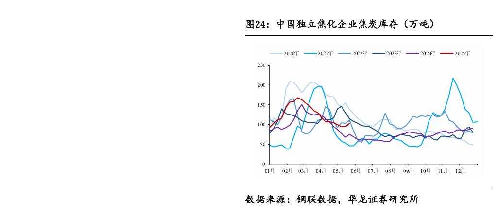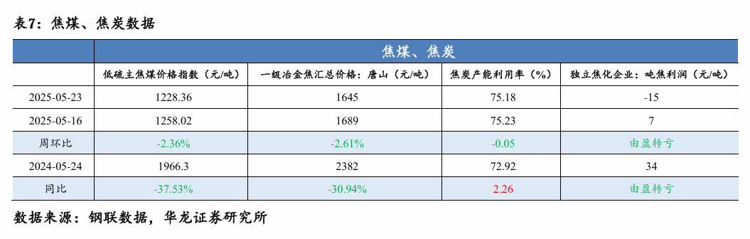焦煤&焦炭:截至2025年5月23日,低硫主焦煤价格指数1228.36元/吨,周环比下降2.36%,同比下降37.53%;唐山一级冶金焦汇总价格1645元/吨,周环比下降2.61%,同比下降30.94%;230家独立焦化厂产能利用率75.18%,周环比下降0.05 pct,同比上升2.26 pct;独立焦化企业:吨焦利润-15元/吨,周环比由盈转亏