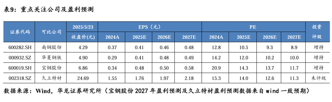 投资建议:财政政策预期宽松及市值管理落地都有望带动板块估值提升。需求端,行业有望在地产基建筑底企稳、制造业持稳向好的支撑下保持平稳。供给端,在经历长时间亏损后,已就促进联合重组和落后产能退出的必要性达成共识。产业集中度提升、产量结构调整、产品高质量发展是行业转型的必然趋势,维持行业“推荐”评级,建议关注:1)具有产品结构优势及规模效应的行业龙头:南钢股份(600282.SH)、华菱钢铁等(000932.SZ);宝钢股份(600019.SH);2)具有高壁垒、高附加值产品的特钢公司:久立特材(002318.SZ)。