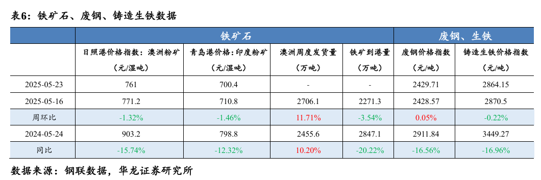 成本端:铁矿石:截至2025年5月23日,澳洲粉矿日照港62%Fe价格指数761元/湿吨,周环比下降1.32%,同比下降15.74%;印度粉矿青岛港61%Fe价格700.4元/湿吨,周环比下降1.46%,同比下降12.32%;截至2025年5月16日,19个港口澳洲&巴西铁矿石发货量2706.1万吨,周环比上升11.71%,同比上升10.20%;45个港口铁矿到港量2271.3万吨,周环比下降3.54%,同比下降20.22%。废钢&铸造生铁:截至2025年5月23日,废钢综合绝对价格指数2429.71元/吨,周环比上升0.05%,同比下降16.56%;铸造生铁综合绝对价格指数2864.15元/吨,周环比下降0.22%,同比下降16.96%。焦煤&焦炭:截至2025年5月23日,低硫主焦煤价格指数1228.36元/吨,周环比下降2.36%,同比下降37.53%;唐山一级冶金焦汇总价格1645元/吨,周环比下降2.61%,同比下降30.94%;230家独立焦化厂产能利用率75.18%,周环比下降0.05 pct,同比上升2.26 pct;独立焦化企业:吨焦利润-15元/吨,周环比由盈转亏。