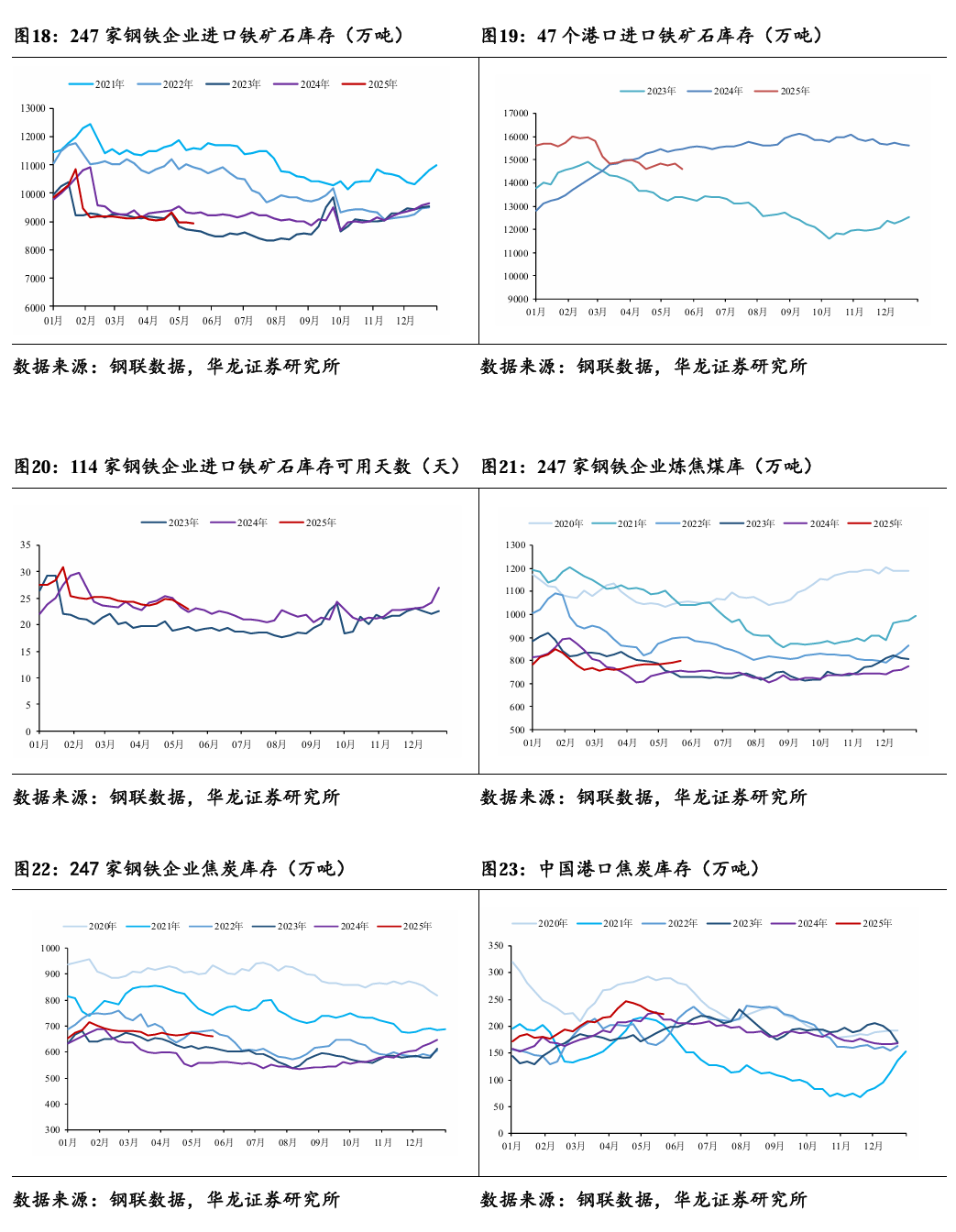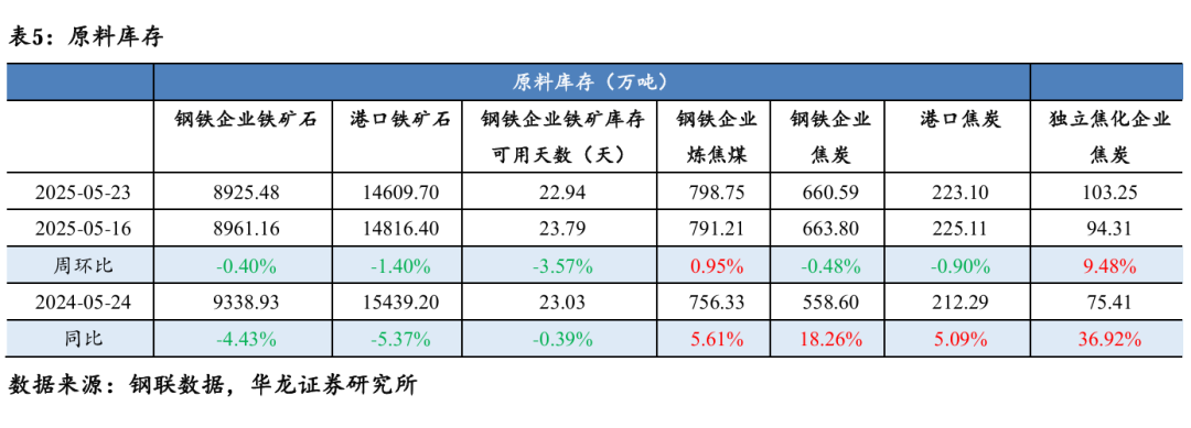 截至2025年5月23日,247家钢铁企业进口铁矿石库存8925.48万吨,周环比下降0.40%,同比下降4.43%;47个港口进口铁矿石库存14609.70万吨,周环比下降1.40%,同比下降5.37%;114家钢铁企业进口铁矿石库存可用天数22.94天,周环比下降3.57%,同比下降0.39%;247家钢铁企业炼焦煤库798.75万吨,周环比上升0.95%,同比上升5.61%;247家钢铁企业焦炭库存660.59万吨,周环比下降0.48%,同比上升18.26%;中国港口焦炭库存223.10万吨,周环比下降0.90%,同比上升5.09%;中国独立焦化企业焦炭库存103.25万吨,周环比上升9.48%,同比上升36.92%。