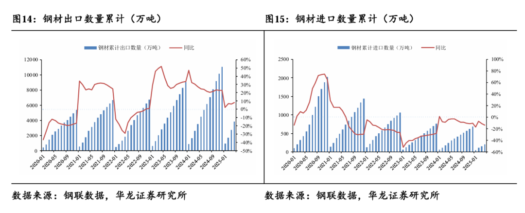 截至2025年5月23日,五大钢材合计消费量904.56万吨,周环比下降1.01%,同比下降4.80%;主流贸易商建筑用钢日成交量8.90万吨,周环比下降8.19%,同比下降36.85%;截至2025年4月,钢材单月出口数量合计1046.24万吨,月环比上升0.06%,同比上升13.42%,月度累计出口数量合计3789.09万吨,月环比上升38.14%,同比上升8.19%。