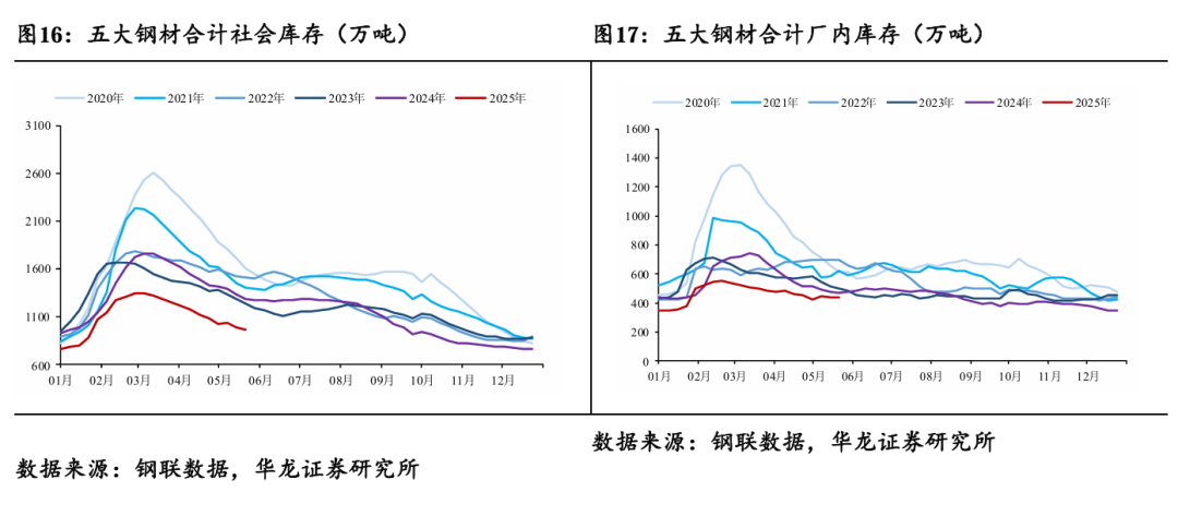 库存端:截至2025年5月23日,五大钢材合计社会库存960.56万吨,周环比下降3.33%,同比下降25.51%;五大钢材合计厂内库存437.98万吨,周环比上升0.23%,同比下降6.67%。本周五大钢材社会库存下降显著,厂内库存小幅增加。