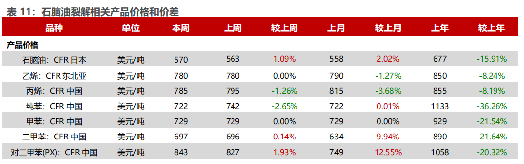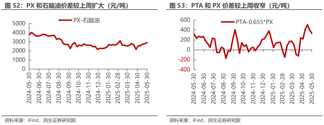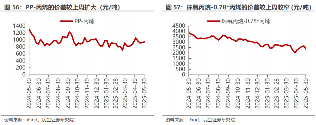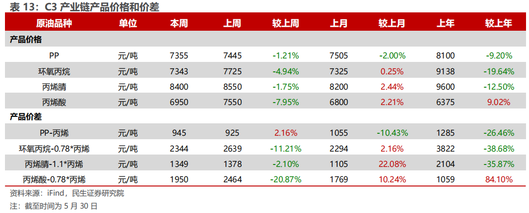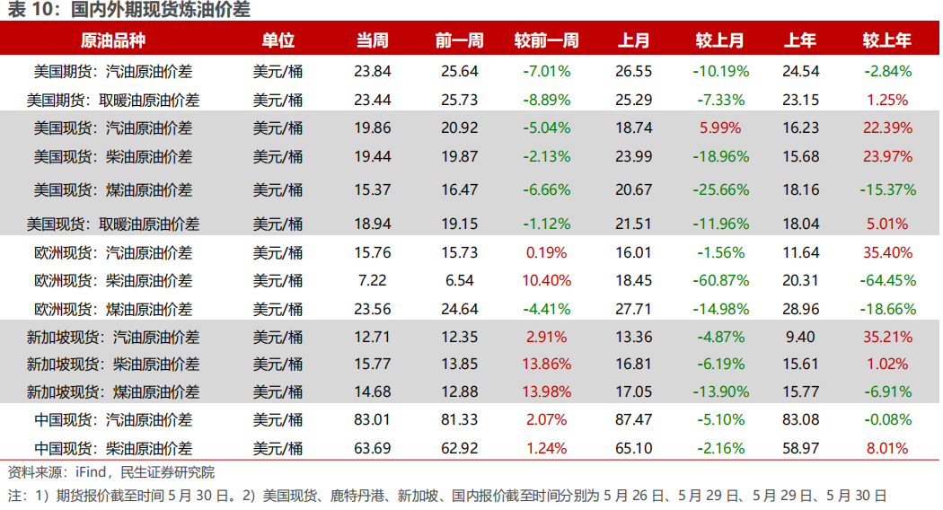 汽油价差收窄,烯烃价差收窄。截至5月30日,1)炼油板块,NYMEX汽油和取暖油期货结算价为2.02/2.01美元/加仑,周环比变化-2.91%/-3.47%,和WTI期货结算价差分别为23.84/23.44美元/桶,周环比变化-7.01%/-8.89%。2)化工板块,乙烯/丙烯/甲苯和石脑油价差为211/216/159美元/吨,较上周变化-2.83%/-6.96%/-3.71%;FDY/POY/DTY价差为1594/1244/2394元/吨,较上周变化+1.65%/-3.80%/-2.01%。