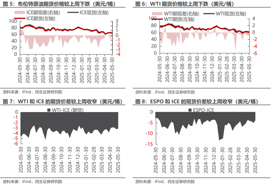 原油期货:据iFind数据,截至2025年5月30日,布伦特原油期货结算价为63.90美元/桶,较上周下跌1.36%;WTI期货结算价60.79美元/桶,较上周下跌1.20%。