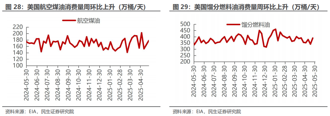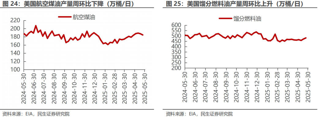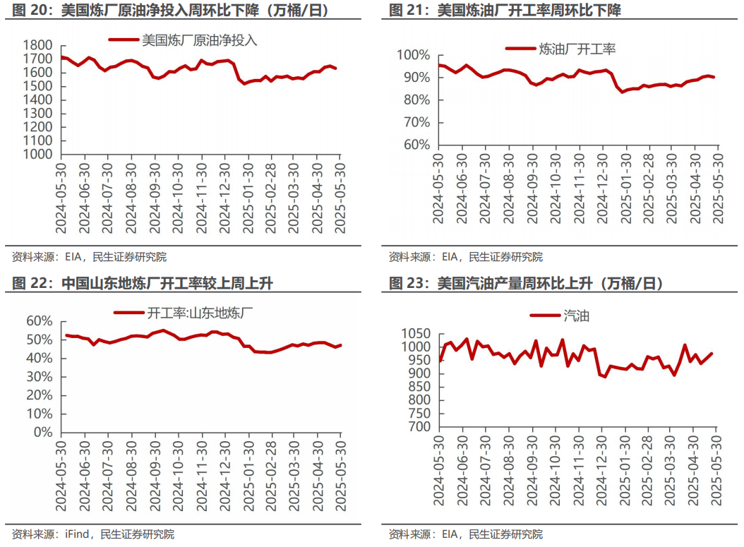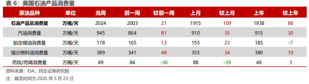 美国原油产量上升,炼油厂日加工量下降。截至5月23日,1)原油方面,美国原油产量1340万桶/日,周环比+1万桶/日。2)成品油方面,美国炼油厂日加工量为1633万桶/日,周环比-16万桶/日;炼厂开工率90.2%,周环比-0.5pct;汽油/航空煤油/馏分燃料油产量分别为975/185/481万桶/日,周环比+19/-3/+10万桶/日。