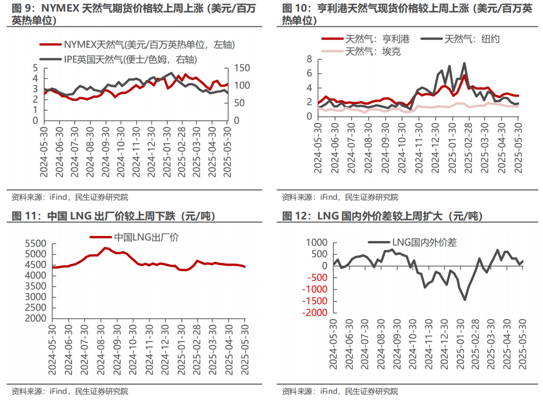 截至2025年5月30日,NYMEX天然气期货收盘价为3.46美元/百万英热单位,较上周上涨4.47%;东北亚LNG到岸价格为12.03美元/百万英热,较上周下跌4.07%;中国LNG出厂价为4419元/吨,较上周下跌1.12%。