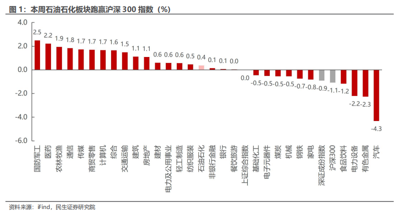 截至5月30日,本周沪深300下跌1.1%,中信石油石化板块上涨0.4%。各子板块中,炼油子板块周涨幅最大,为1.2%;油品销售及仓储周跌幅最大,为-3.0%。