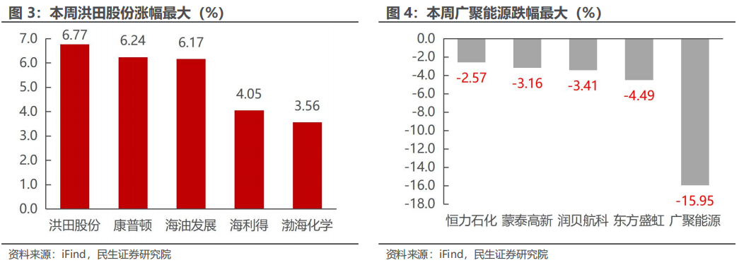 本周洪田股份(维权)涨幅最大。截至5月30日,石油石化行业中,公司周涨跌幅前5位分别为:洪田股份上涨6.77%,康普顿上涨6.24%,海油发展上涨6.17%,海利得上涨4.05%,渤海化学上涨3.56%。