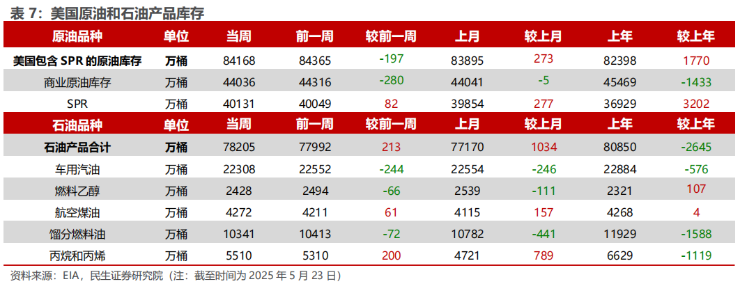 美国原油库存下降,汽油库存下降。截至5月23日,1)原油方面,美国战略原油储备40131万桶,周环比+82万桶;商业原油库存44036万桶,周环比-280万桶。2)成品油方面,车用汽油/航空煤油/馏分燃料油库存分别为22308/4272/10341万桶,周环比-244/+61/-72万桶。