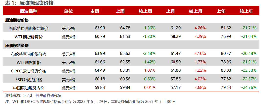 原油现货:截至2025年5月30日,布伦特原油现货价格63.99美元/桶,较上周下跌2.48%;中国原油现货均价为59.84美元/桶,较上周上涨0.01%;截至2025年5月29日,WTI现货价格61.66美元/桶,较上周下跌1.42%。