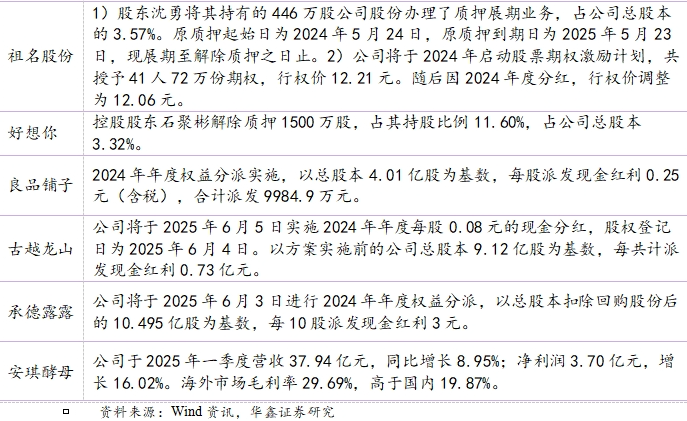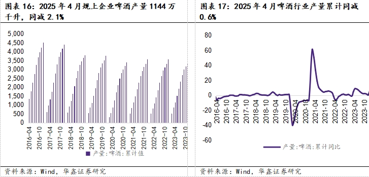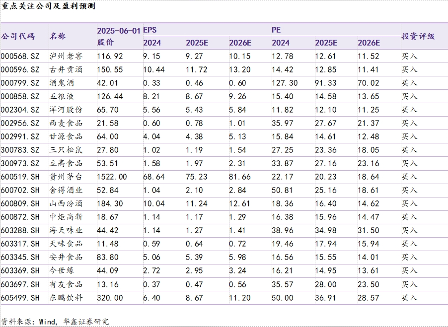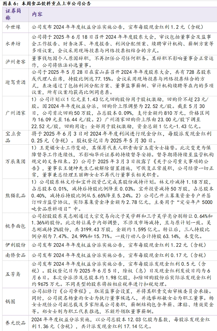 白酒板块:近日最新条例发布公务接待工作餐不上酒,市场情绪影响白酒板块回调。近日,中共中央、国务院印发了修订后的《党政机关厉行节约反对浪费条例》,强化厉行勤俭节约、反对铺张浪费责任落实,第四章公务接待强调工作餐不得提供高档菜肴,不得提供香烟,不上酒,白酒政务需求进一步缩减,由于高端价格带政务消费占比已处于较低水平,因此政策端主要影响情绪面表现。本周山西汾酒举办股东大会,公司将以“四轮驱动”应对市场环境变化,玻汾继续控量,老白汾下放费投权限,青花20为主要增长引擎,青花26与7月即将推出的青花30将在600-1000元价格带展开精准竞争,2025年在山西及其周边市场打造为更大“核心大本营”,并在长三角、粤港澳大湾区等重点区域力争实现超越全国平均水平的增长。基本面来看,预计端午期间白酒行业需求延续筑底趋势,商务需求整体表现承压,宴席需求表现分化,企业端主动给渠道降负,库存平稳消化。估值端看,板块整体估值偏低,酒企回购或增持动作较多,分红力度持续提升,后续关注内需政策发布及白酒作为低配板块有望迎来资金流入。分两条主线推荐,估值优势推荐:水井坊、山西汾酒、舍得酒业、酒鬼酒;全年推荐:五粮液、泸州老窖、山西汾酒、今世缘、古井贡酒、迎驾贡酒。