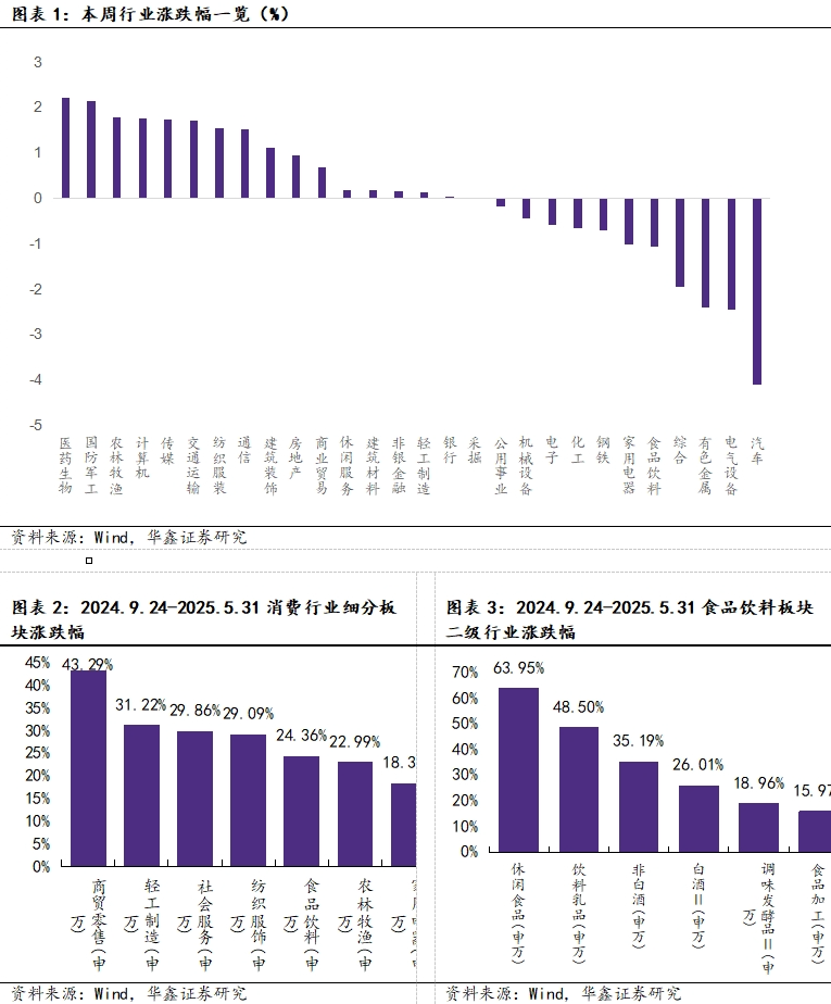 大众品板块:本周我们参加立高食品股东大会,组织均瑶健康、好想你线上交流。立高食品来看,新国标对公司稀奶油基本无影响,后续成本压力环比下降,叠加公司窗口期锁单+原料国产化替代+延360pro价格带延伸布局高毛利产品,预计利润端持续释放。均瑶健康来看,公司每日系列低温新品目前已布局上海、华东罗森系统,预计6-7月推广至全国现代通路,通过新品验证泛缘供应链通路适配能力,目前单点产出表现优于竞品,后续关注旺季动销表现。 好想你来看,目前饮品团队已组建完毕,后续主要进攻线下零售与餐饮特渠,山姆渠道黑金枣预计2025H1前可完成全国门店铺货,新品仍在持续送样,零食量贩sku按照13+8进行初步规划,电商渠道短期仍以扭亏为主要目标,全年业绩增长点充足。基本面来看,传统消费端,受益于会员制/零食量贩等高势能渠道导入、品类红利释放的公司业绩呈现明显韧性,同时商超调改对于自有品牌代工需求有明显催化,为B端企业提供增量空间。新消费板块,在扩内需政策托底、消费偏好迭代与技术创新等多重共振下,需求侧涌现更多结构性机会,渠道与品类红利持续释放。目前大众品预期持续修复中,推荐:西麦食品、有友食品、甘源食品、三只松鼠、东鹏饮料;饮料板块临近旺季,零售渠道变革下关注新消费机会,建议关注:古茗、蜜雪集团、锅圈、老铺黄金。生育政策出台叠加原奶周期反转预期下,催化乳制品板块需求,长期提示机会:优然牧业、现代牧业、伊利股份和蒙牛乳业。