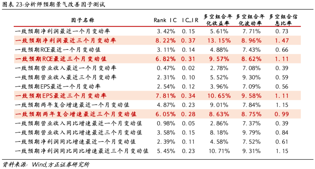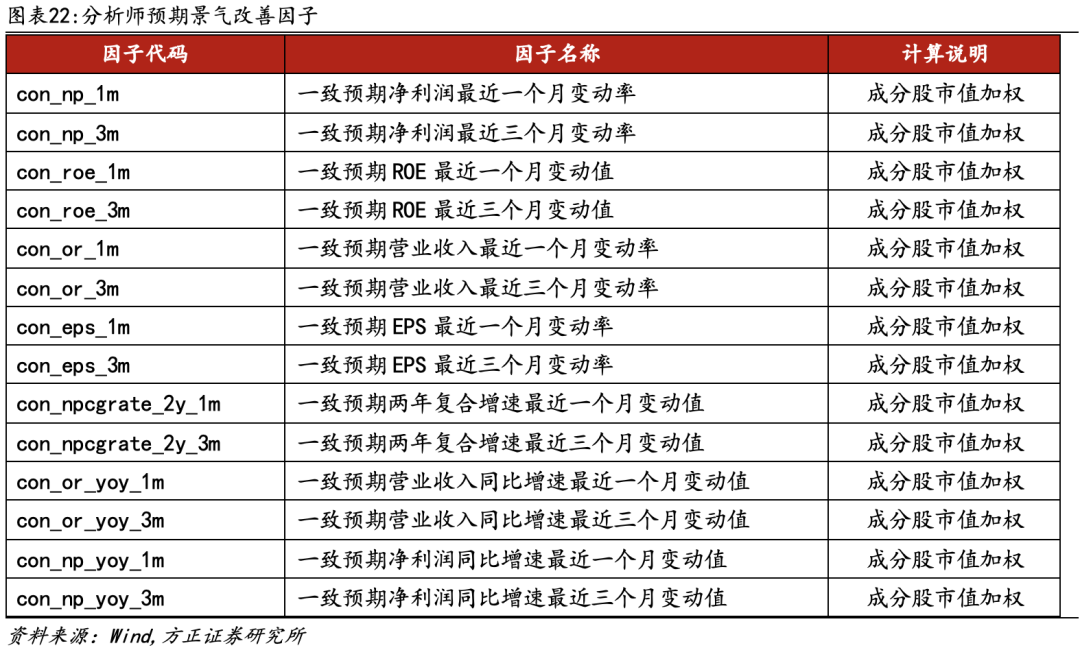 基本面景气因子虽然表现不错,但其更新较慢滞后较为明显,分析师预期数据可作为有效的补充。我们通过指数成分股市值加权的方式构建标的指数的一致预期指标及其变动指标,来刻画分析师预期景气改善因子。