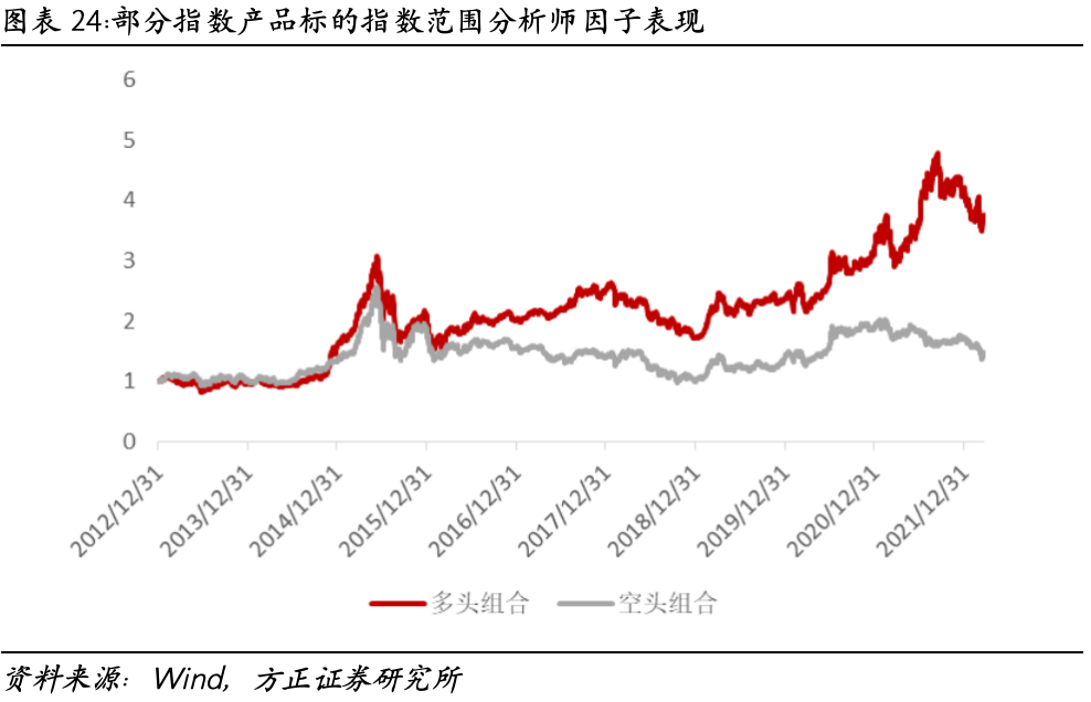 基于估值因子的上述表现特征,我们根据宏观经济周期对估值因子进行选择,当进入宽货币宽信用周期,我们选择估值分位数因子,当市场进入宽货币紧信用、紧货币宽信用、紧货币紧信用等周期时,我们选择PEG因子来构建估值因子,并在部分指数产品的标的指数范围内测试其表现,可以看到长期来看,在特定指数范围内估值因子表现出了较好的分化特征。
