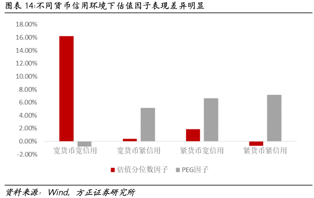 估值因子表现受货币信用周期影响较为显著,在宽货币宽信用环境下,估值分位数因子表现出非常强势的正向选择能力,即在货币信用双宽松的环境下,市场风险偏好提升,高估值行业表现更为出色,而其他区间内估值分位数因子均无明显区分能力。与此同时,在宽货币宽信用环境,PEG因子表现基本失效,而在其他区间范围内,PEG因子表现较好,特别是货币信用双紧的时间段,PEG因子表现更佳。
