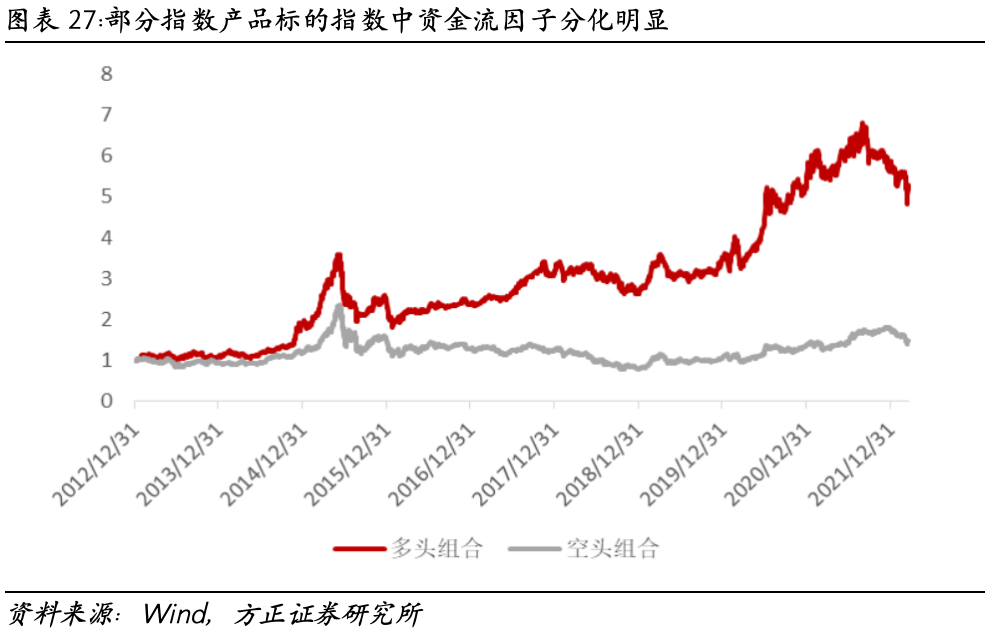 我们根据上述因子在不同宏观环境下的表现对因子进行选择与合成,从合成后因子表现来看,资金流因子整体表现出色,在部分指数产品标的指数范围内多空分化能力较强。