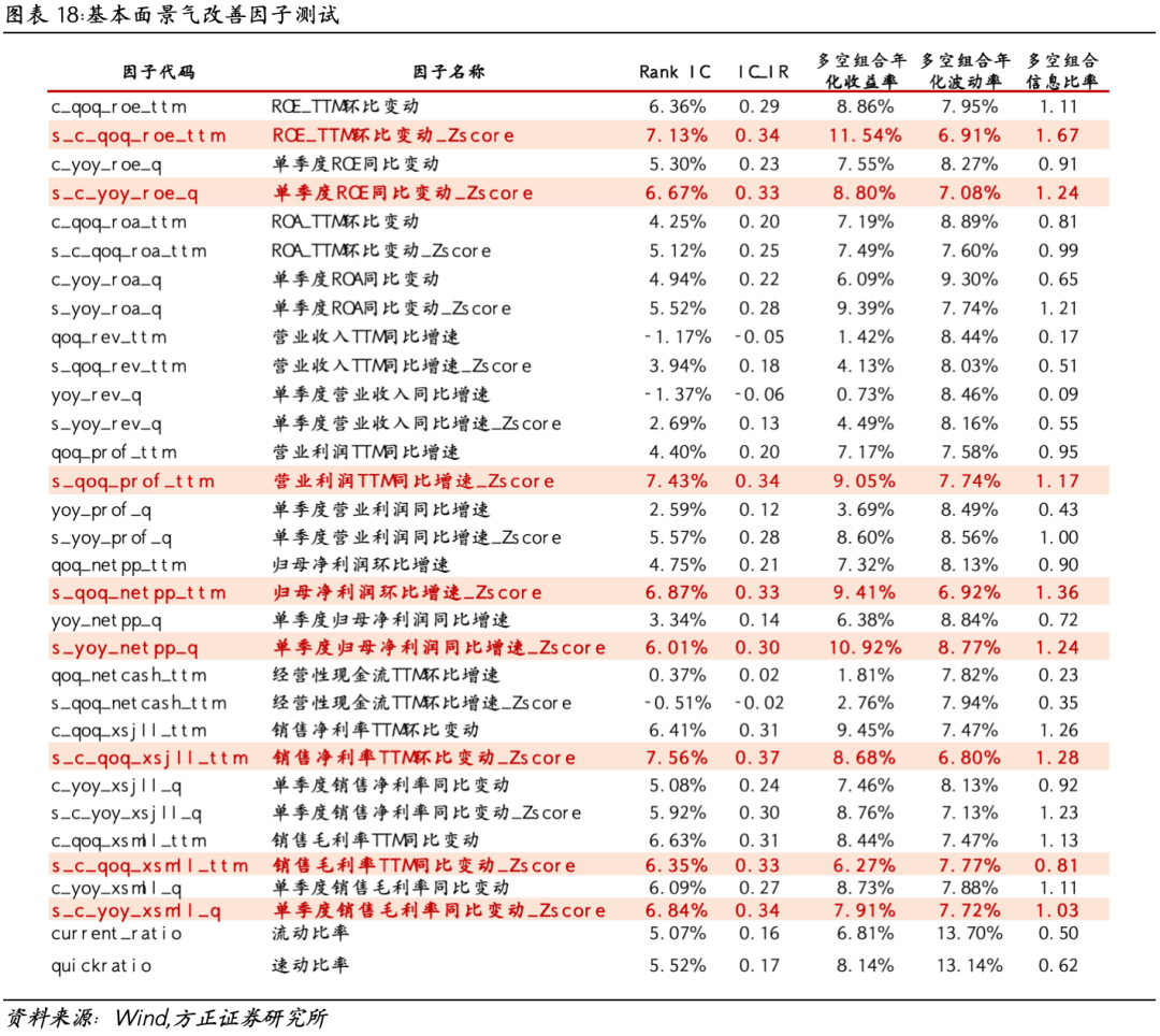 具体做法是,我们通过计算指数基本财务指标如营业利润、归母净利润、ROE等累计值、TTM及单季度的同比及环比指标,再在此基础之上,通过时间序列标准化的方式,计算其Zscore指标,时间窗口为最近8个季度。从单因子测试结果来看,经标准化处理的基本面景气指标,相较于原始指标有效性得到明显提升。