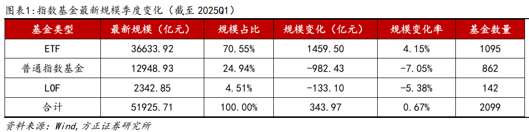 自国内首只指数基金于2002年成立以来,国内指数基金业务发展迅速,特别是自2018年以来,随着ETF市场的快速发展,指数基金规模大幅增长。截至2025年一季度末,国内指数基金数量达到2099只,规模合计51925.71亿元,其中ETF产品数量1095只,规模合计36633.92亿元(不含ETF联接基金),占全部指数基金总规模的70.55%。