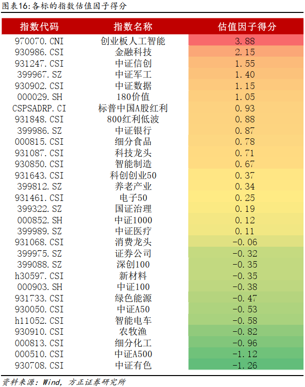 根据最新宏观环境下估值因子得分,创业板人工智能、金融科技、中证信创、中证军工等指数得分较高。