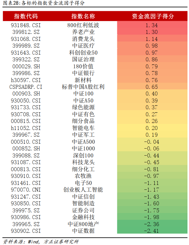 截至2025年5月底,根据最新资金流因子得分,800红利低波、养老产业、消费龙头、中证医疗等指数得分较高。