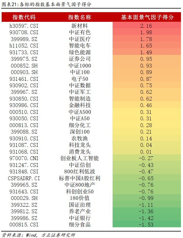 截至2025年5月底,根据最新基本面景气因子得分,新材料、中证有色、中证医疗、智能电车等指数得分较高。