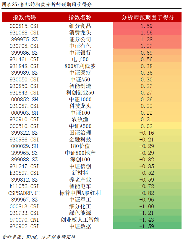 截至2025年5月底,根据最新分析师预期因子得分,细分食品、消费龙头、证券公司、中证有色等指数得分较高。