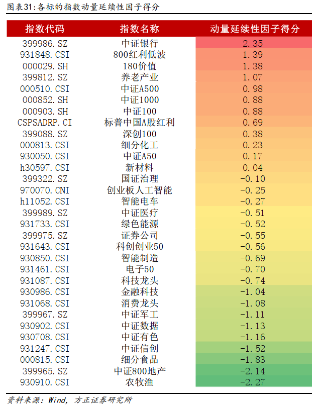 截至2025年5月底,根据最新动量延续性因子得分,中证银行、800红利低波、180价值、养老产业等指数得分较高。