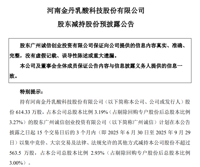 6月8日,金丹科技发布公告,持有公司股份614.33万股,占公司总股本比例3.19%(占剔除回购专户股份后总股本比例3.27%)的股东广州诚信创业投资有限公司(以下简称广州诚信),计划在公告披露之日起15个交易日后的3个月内(即2025年6月30日至2025年9月29日)以集中竞价、大宗交易及法律、法规允许的其他方式减持公司股份不超过563.5万股,占公司总股本比例2.93%(占剔除回购专户股份后总股本比例3.00%)。