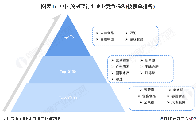 2024年3月,第二届中国国际(佛山)预制菜产业大会在佛山开幕会上《2024胡润中国预制菜生产企业百强榜暨大单品冠军榜》发布,该榜单从四个维度进行评选:企业价值、2023全年企业在预制菜领域的投入与举措、企业预制菜业务在总体营收中的占比、企业重点预制菜产品在预制菜细分领域的市场份额。根据该榜单排名,安井食品独占行业第一,百胜中国、双汇、绝味食品和味知香排名第二至第五,这些企业在食品加工和餐饮领域具有强劲的竞争优势,是速冻主食、油炸食品、预制菜肴等产品生产的龙头企业,处于第一竞争梯队;盒马鲜生、广东酒家等同样是行业代表上市公司,企业属于第二竞争梯队。新上榜的TOP100企业,如五芳斋、老乡鸡、大湖股份、全聚德等,凭借粽子、鸡肉、烤鸭等特色产品,形成细分领域的竞品,出于行业第三竞争梯队。