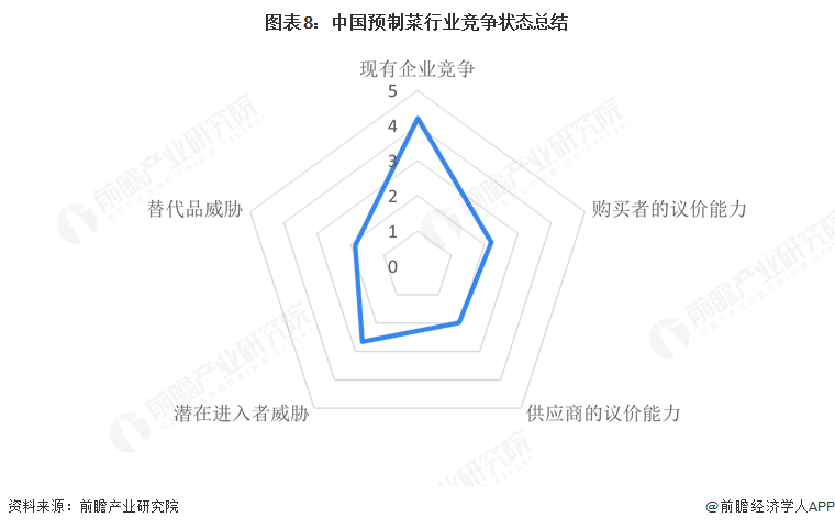 根据以上分析,对各方面的竞争情况进行量化,5代表最大,0代表最小,预制菜行业的竞争情况如下图所示: