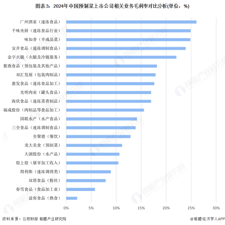 通过对比上市企业预制菜业务营收和增速。双汇发展、安井食品的预制菜产业规模较大,年营收规模核算在百亿元以上,春雪食品、国联水产、光明肉业等上市公司营收规模也处于行业较为领先的位置;从营收增速上看,2024年行业营收普遍出现下降的情况,但2024上半年,安井食品的速冻调制食品、菜肴食品业务实现13.04%的同比增长,煌上煌的屠宰加工收入全年更是实现50%以上的增速,是行业的挑战者。整体来看,预制菜行业在不断发展的同时,各企业间的竞争也日益激烈,业绩表现差异较大,部分企业实现了增长,而较多上市企业面临一定的经营压力。