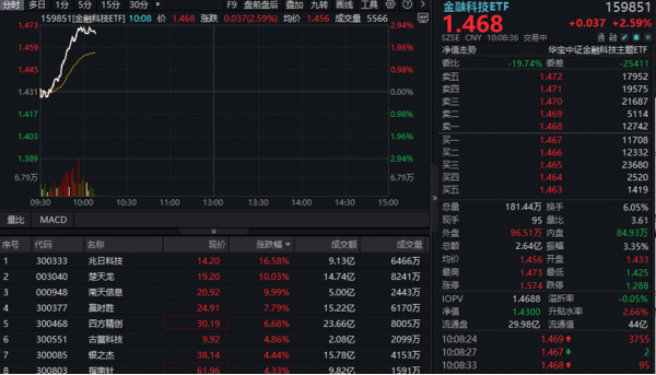 11日早盘,金融科技异动拉升快速涨超2%,互联网券商、数字货币等概念股集体拉升走高!截至发稿,兆日科技一度20CM涨停,南天信息涨停,楚天龙4天3板,赢时胜、银之杰、古鳌科技、长亮科技、指南针、财富趋势等多股跟涨超5%。热门ETF方面,$金融科技ETF(159851)场内价格冲高3%,成交额快速突破2亿元,放量明显。