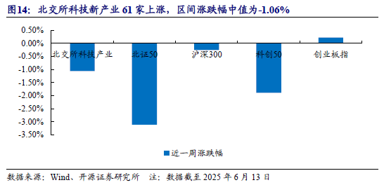 从周度涨跌幅数据来看,2025年6月9日至2025年6月13日,北交所科技新产业149家企业中61家上涨,区间涨跌幅中值为-1.06%,路桥信息+40.41%,同心传动+35.34%,西磁科技+26.29%,花溪科技+25.52%,七丰精工+21.13%位列涨幅前五。北证50、沪深300、科创50、创业板指周度涨跌幅分别为-3.11%、-0.25%、-1.89%、+0.22%。