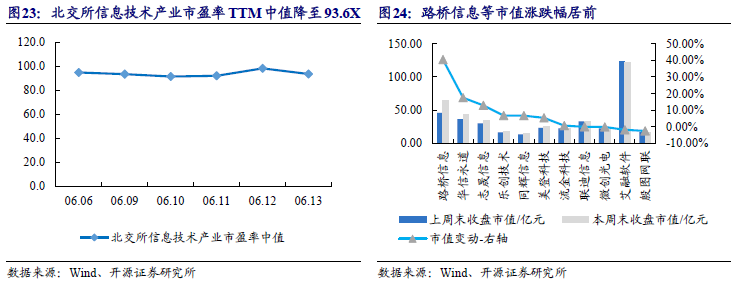 本周,从估值表现看,北交所信息技术产业28家企业的市盈率TTM中值降至93.6X。从本周个股市值表现来看,路桥信息+40.41%、华信永道+17.48%、志晟信息+12.89%分列市值涨跌幅前三甲。(信息技术公司类别:包含集成电路、高端软件、智能终端、高端服务器、网络和通信、云计算等细分行业。)
