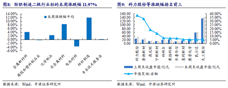 化工新材行业本周市盈率中值升至44.1X,科力股份+37.78%、奔朗新材+33.22%、夜光明+18.60%涨跌幅排名前三。(化工新材包含金属新材料、橡胶和塑料制品业、化学制品、非金属材料、电池材料、纺织制造、专业技术服务业等二级行业)