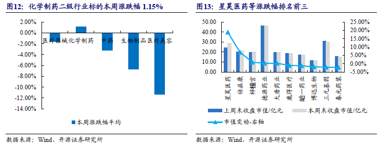 医药生物行业本周市盈率中值降至42.5X,星昊医药+18.95%、倍益康+6.83%、梓橦宫+0.88%涨跌幅排名前三。(医药生物包含医疗器械、化学制药、中药、生物制品、医疗美容)